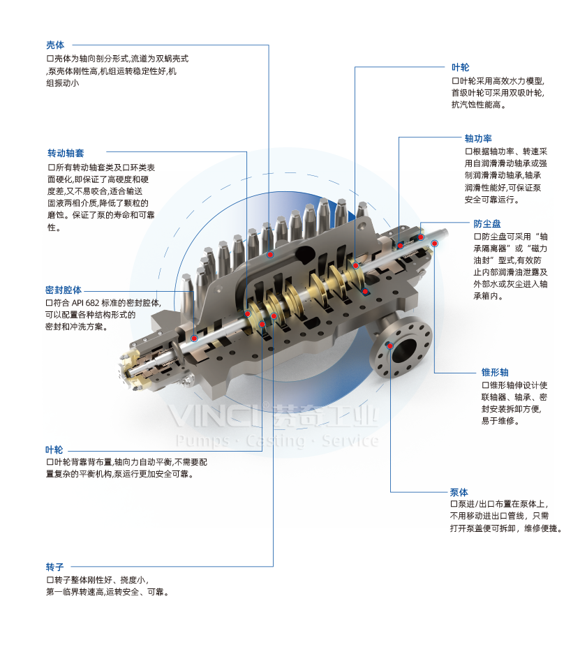 VBBS - C 系列泵是符合API 610 標(biāo)準(zhǔn)的 BB3 型式離心泵。泵體為蝸殼式蝸形體結(jié)構(gòu),中心線支承,葉輪采用對(duì)稱布置,軸向力自動(dòng)平衡,沒有復(fù)雜的平衡機(jī)構(gòu);進(jìn)口和出口布置在殼體的下面,在不移動(dòng)進(jìn)出口管線情況下,可拆卸和安裝泵蓋,便于檢修和更換葉輪,泵軸、級(jí)間襯套等零部件。首級(jí)葉輪可設(shè)計(jì)成單吸或雙吸兩種結(jié)構(gòu)。