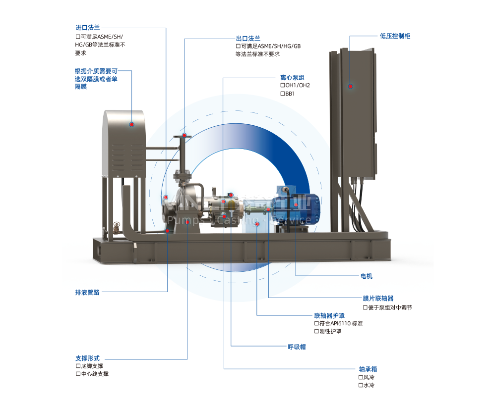 隔膜泵形式:每次(含首次)啟動(dòng)無需灌液,可通過現(xiàn)場(chǎng)液位實(shí)現(xiàn)自吸泵啟停。考慮現(xiàn)場(chǎng)冬季氣候,自吸裝置可設(shè)置水位自動(dòng)回落功能,防止冬季液體冰凍。隔膜泵可設(shè)置雙層隔膜,易燃易爆場(chǎng)合更為安全。離心泵可配OH1、OH2形式,可執(zhí)行API610、ISO5199等標(biāo)準(zhǔn),采用帶加長(zhǎng)段膜片聯(lián)軸器,方便檢維修;機(jī)械密封可按照API682 要求配置各種沖洗方案。自吸高度可達(dá)到5-8米。